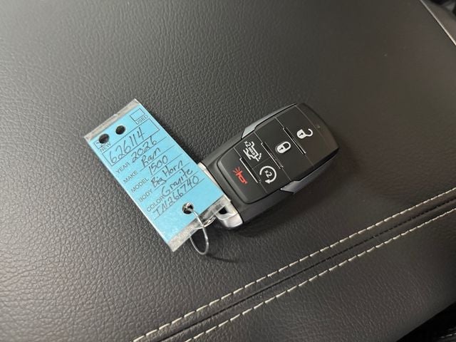 Big Horn Level 2 Equipment Group (115V Auxiliary Power Outlet, 115V Auxiliary Rear Power Outlet, 12 Touchscreen Display, 2nd Row in Floor Storage Bins, 3 Rear Seat Head Restraints, 4 Way Front Headrests, 400W Inverter, 4G LTE Wi-Fi Hot Spot, 9 Amplified Speakers with Subwoofer, Air Conditioning ATC with Dual Zone Control, Apple CarPlay, Auto Power-Folding Mirrors, Auto-Dimming Exterior Driver Mirror, Auto-Dimming Rear-View Mirror, Black Exterior Mirrors, Black Premium Power Mirrors, Body Color Fender Flares, Bucket Seats, Center Console Parts Module, Cluster 7.0 TFT Color Display, Configurable Drive Mode, Connected Travel and Traffic Services, Connectivity - US/Canada, Convex Wide-Angle Exterior Mirror Insert, Deluxe Cloth Bucket Seats, Disassociated Touchscreen Display, Exterior Mirrors Courtesy Lamps, Exterior Mirrors with Heating Element, Exterior Mirrors with Supplemental Signals, Front Seat Back Map Pockets, Full Length Floor Console, Global Telematics Box Module, Glove Box Lamp, Google Android Auto, GPS Antenna Input, GPS Navigation, HD Radio, Heated Front Seats, Heated Steering Wheel, Integrated Center Stack Radio, Integrated Voice Command with Bluetooth®, Leather Wrapped Steering Wheel, LED Dome Lamp with on/Off Switch, LED Footwell Lighting, Manual Adjust 4-Way Front Passenger Seat, Media Hub with 2 Charge Only USBs, Overhead LED Lamps, Power 2-Way Driver Lumbar Adjust, Power Adjust 8-Way Driver Seat, Power Adjustable Pedals, Premium Overhead Console, Radio: Uconnect 5 Navigation with 12.0 Display, Rear 60/40 Folding Seat, Rear Center Armrest, Rear Power Sliding Window, Rear Window Defroster, Remote Tailgate Release, Security Alarm, SiriusXM Radio Service, SiriusXM with 360L, Steering Wheel Mounted Audio Controls, Sun Visors with Illuminated Vanity Mirrors, Universal Garage Door Opener, and USB Host Flip), Night Edition (Accent Color Door Handles, Accent Color Premium Power Mirrors, Accent Color Tailgate Handle, Anti-Spin Differential Rear Axle, Black Exterior Truck Badging, Black Headlamp Bezels, Black Interior Accents, Black Painted Exterior Mirrors Caps, Black Tail Lamp Bezels, Body Color Front Bumper, Body Color Rear Bumper with Step Pads, Dual Exhaust with Black Tips, Grille Black Surround Black Mesh, RAM Grille Badge - Black, and Wheels: 20 x 9.0 Aluminum Painted Clad), Quick Order Package 27Z Big Horn, Towing Technology Group (Trailer Hitch Line-Up Assist), Trailer Tow Group (Black Trailer Tow Power Mirrors, Manual Folding Exterior Mirrors, Manual Telescoping Mirrors, Mirror Clearance/Running Lights, Power-Adjustable Convex Aux Mirrors, Trailer Brake Control, Trailer Reverse Steering Control, Trailer Tire Pressure Monitoring System, and Trailer Tow Mirrors), 12-Way/1-Way Trailer Connector, 4-Wheel Disc Brakes, 48V Belt Starter Generator, 6 Speakers, ABS brakes, Air Conditioning, Alloy wheels, AM/FM radio, Apple CarPlay/Android Auto, Auto High-beam Headlights, Brake assist, Bumpers: chrome, Cloth Bucket Seats, Cluster 12 TFT Color Display, Compass, Delay-off headlights, Driver door bin, Dual front impact airbags, Dual front side impact airbags, El Prices based on dealer discounts and rebates. Some rebates may be for lease to purchase program, see dealer for details. Not all customers qualify for all rebates.$2000 - 2026 National Select Inventory Bonus Cash. Exp. 03/02/2026 $3500 - 2026 National Retail Consumer Cash . Exp. 03/02/2026 $500 - 2026 Great Lakes BC Truck Month Bonus Cash .