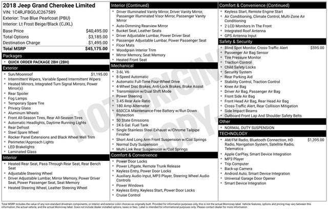 This 2018 Jeep Grand Cherokee Limited 3.6 Liter V6 4WD is a standout choice for the discerning driver. Boasting a powerful 3.6L V6 engine paired with an 8-speed automatic transmission, this SUV delivers impressive performance and efficiency, with an EPA-estimated 18 city/25 highway MPG.